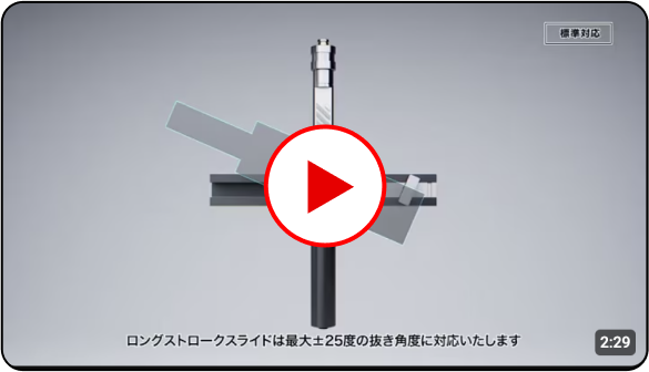 エジェクタープレートに対し垂直の突出しで2枚のバネ鋼が広がりアンダーカットを処理します。型設計、型構造のシンプル化により加工時間を大幅に短縮します。