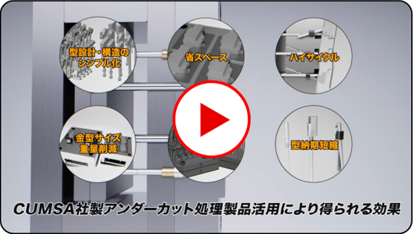 金型サイズダウン - 型開量削減|加工時間短縮|コンパクト化|キャビ取られ防止|グリスフリー|型作動トラブル防止|金型重量低減|ハイサイクル|内側アンダーカット|横スライド|外側スライド|内ネジ|内溝|型費削減|2枚羽|4枚羽|組込み・バラシ時間短縮