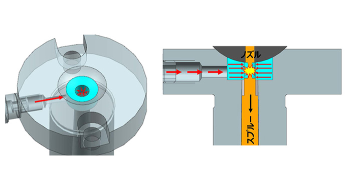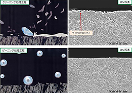 微粒子を圧縮性の気体に混合して金属表面に高速衝突させる金属表面改質技術です。離型性だけでなく耐摩耗性、疲労強度、表面硬度も向上します。